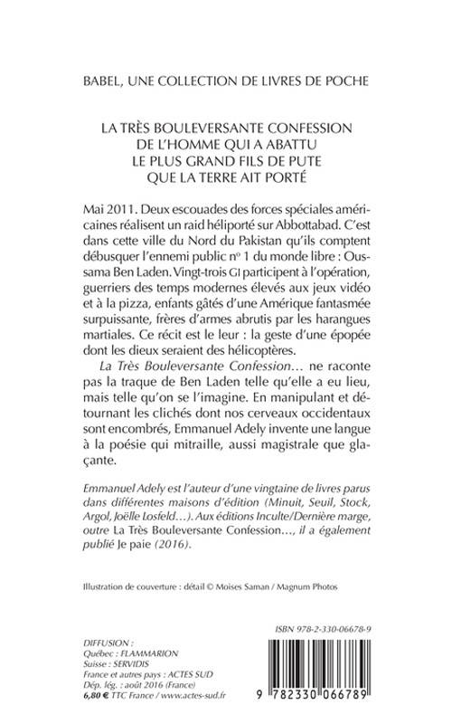 «La Très Bouleversante Confession...» ne raconte pas la traque de Ben Laden telle qu'elle a eu lieu, mais telle qu'on se l'imagine. En manipulant et détournant les clichés dont nos cerveaux occidentaux sont encombrés, Emmanuel Adely invente une langue à la poésie qui mitraille, aussi magistrale que glaçante.
