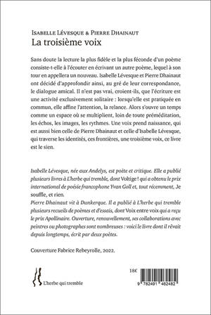 Sans doute la lecture la plus fidèle et la plus féconde d’un poème consiste-t-elle à l’écouter en écrivant un autre poème, lequel à son tour en appellera un nouveau. Isabelle Lévesque et Pierre Dhainaut ont décidé d’approfondir ainsi, au gré de leur correspondance, le dialogue amical. Il n’est pas vrai, croient-ils, que l’écriture est une activité exclusivement solitaire : lorsqu’elle est pratiquée en commun, elle affine l’attention, la relance. Alors s’ouvre un temps comme un espace où se multiplient, loin de toute préméditation, les échos, les images, les rythmes. Une voix prend naissance, qui est aussi bien celle de Pierre Dhainaut et celle d’Isabelle Lévesque, qui traverse les identités, ces frontières, une troisième voix, ce livre est le sien.