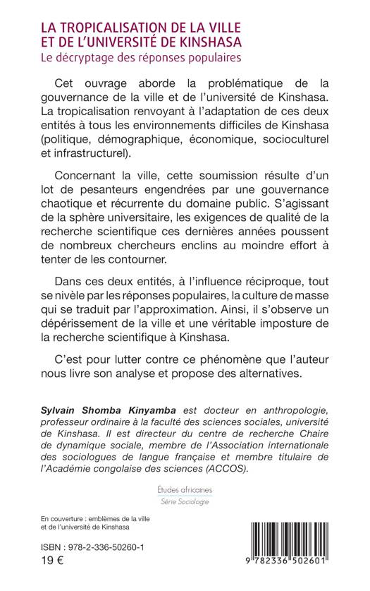 Cet ouvrage aborde la problématique de la gouvernance de la ville et de l’université de Kinshasa. La tropicalisation renvoyant à l’adaptation de ces deux entités à tous les environnements difficiles de Kinshasa (politique, démographique, économique, socioculturel et infrastructurel). Concernant la ville, cette soumission résulte d’un lot de pesanteurs engendrées par une gouvernance chaotique et récurrente du domaine public. S’agissant de la sphère universitaire, les exigences de qualité de la recherche scientifique ces dernières années poussent de nombreux chercheurs enclins au moindre effort à tenter de les contourner. Dans ces deux entités, à l’influence réciproque, tout se nivèle par les réponses populaires, la culture de masse qui se traduit par l’approximation. Ainsi, il s’observe un dépérissement de la ville et une véritable imposture de la recherche scientifique à Kinshasa. C’est pour lutter contre ce phénomène que l’auteur nous livre son analyse et propose des alternatives.