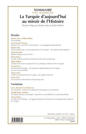 Soucieux d'observer la Turquie moderne sans jamais perdre de vue l'éclairage essentiel qu'apporte l'examen du passé, les auteurs ont souhaité revenir sur quelques-uns des sujets qui interpellent le pays aujourd'hui. Entre autres : L'euroscepticisme ; tentative de mise en perspective de la politique extérieure turque ; la doctrine Davutoglu ; l'AKP et l'autoritarisme en Turquie ; aux sources du dynamisme turc...