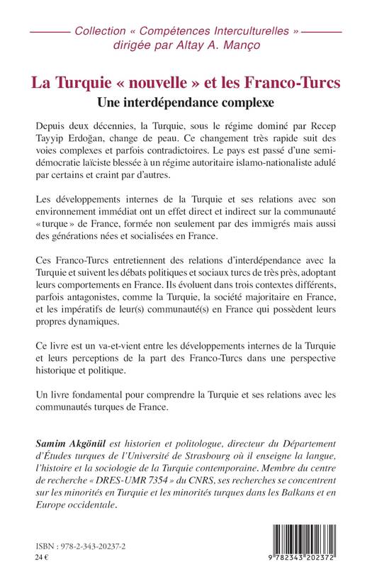 Depuis deux décennies, la Turquie, sous le régime dominé par Recep Tayyip Erdogan, change de peau. Les développements internes de la Turquie et ses relations avec son environnement immédiat ont un effet direct et indirect sur la communauté « turque » de France, formée non seulement par des immigrés mais aussi des générations nées et socialisées en France. Ces Franco-Turcs entretiennent des relations d'interdépendance avec la Turquie et suivent les débats politiques et sociaux turcs de très près. Ce livre est un va-et-vient entre les développements internes de la Turquie et leurs perceptions de la part des Franco-Turcs dans une perspective historique et politique.