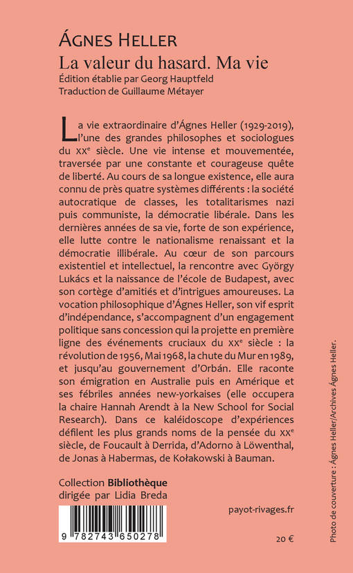 La vie extraordinaire d'Ágnes Heller (1929-2019), l'une des grandes philosophes et sociologues du xxe siècle. Une vie intense et mouvementée, traversée par une constante et courageuse quête de liberté. Au cours de sa longue existence, elle aura connu de près quatre systèmes différents : la société autocratique de classes, les totalitarismes nazi puis communiste, la démocratie libérale. Dans les dernières années de sa vie, forte de son expérience, elle lutte contre le nationalisme renaissant et la démocratie illibérale. Au coeur de son parcours existentiel et intellectuel, la rencontre avec György Lukács et la naissance de l'école de Budapest, avec son cortège d'amitiés et d'intrigues amoureuses. La vocation philosophique d'Ágnes Heller, son vif esprit d'indépendance, s'accompagnent d'un engagement politique sans concession qui la projette en première ligne des événements cruciaux du xxe siècle : la révolution de 1956, Mai 1968, la chute du Mur en 1989, et jusqu'au gouvernement d'Orbán. Elle raconte son émigration en Australie puis en Amérique et ses fébriles années new-yorkaises (elle occupera la chaire Hannah Arendt à la New School for Social Research). Dans ce kaléidoscope d'expériences défilent les plus grands noms de la pensée du xxe siècle, de Foucault à Derrida, d'Adorno à Löwenthal, de Jonas à Habermas, de Kołakowski à Bauman.