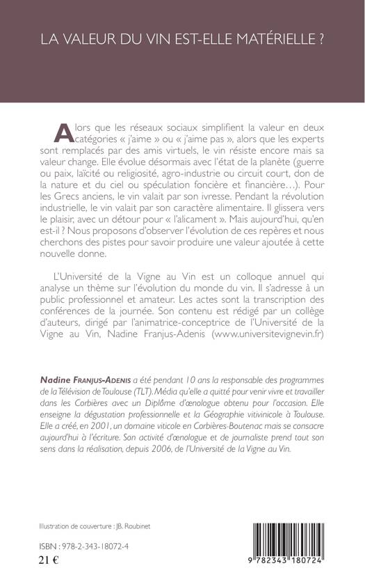 Alors que les réseaux sociaux simplifient la valeur en deux catégories « j'aime » ou « j'aime pas », alors que les experts sont remplacés par des amis virtuels, le vin résiste mais sa valeur change. Pour les Grecs anciens, il valait par son ivresse. Pendant la révolution industrielle, le vin valait par son caractère alimentaire. Il glissera vers le plaisir, avec un détour pour « l'alicament ». Mais aujourd'hui ? L'ouvrage se propose d'analyser la situation contemporaine. L'Université de la Vigne au Vin est un colloque annuel sur l'évolution du monde du vin, sous la direction de l'animatrice-conceptrice de l'Université de la Vigne au Vin, Nadine Franjus-Adenis (www.universitevignevin.fr).