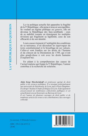 La vie politique actuelle fait apparaître la fragilité de la Ve République; elle peine à trouver son équilibre. Se voulant un régime politique sui generis, elle est devenue la République des faux-semblants: ceux de sa stabilité comme en témoignent les multiples révisions qui fragilisent sa légitimité, ceux de son efficacité et de son identité. Leurs causes tiennent à l'ambigüité des conditions de sa naissance, d'où découlent les équivoques du texte constitutionnel et le brouillage de ses valeurs. Celles-ci sont fondées sur les droits de l'homme et du citoyen de la Déclaration de 1789, qui n'ont plus grand-chose à voir avec les droits humains d'aujourd'hui. En aidant à la compréhension des causes de l'actuel malaise qui frappe la Ve République, l'auteur contribue à la recherche de solutions.