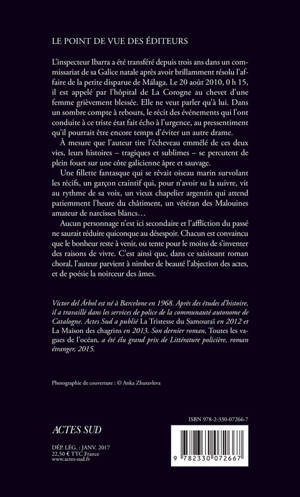 L'inspecteur Ibarra a été transféré depuis trois ans dans un commissariat de sa Galice natale après avoir brillamment résolu l'affaire de la petite disparue de Málaga. Le 20 août 2010, 0 h 15, il est appelé par l'hôpital de La Corogne au chevet d'une femme grièvement blessée. Elle ne veut parler qu'à lui. Dans un sombre compte à rebours, le récit des événements qui l'ont conduite à ce triste état fait écho à l'urgence, au pressentiment qu'il pourrait être encore temps d'éviter un autre drame. À mesure que l'auteur tire l'écheveau emmêlé de ces deux vies, leurs histoires - tragiques et sublimes - se percutent de plein fouet sur une côte galicienne âpre et sauvage. Une fillette fantasque qui se rêvait oiseau marin survolant les récifs, un garçon craintif qui, pour n'avoir su la suivre, vit au rythme de sa voix, un vieux chapelier argentin qui attend patiemment l'heure du châtiment, un vétéran des Malouines amateur de narcisses blancs... Aucun personnage n'est ici secondaire et l'affliction du passé ne saurait réduire quiconque au désespoir. Chacun est convaincu que le bonheur reste à venir, ou tente pour le moins de s'inventer des raisons de vivre. C'est ainsi que, dans ce saisissant roman choral, l'auteur parvient à nimber de beauté l'abjection des actes, et de poésie la noirceur des âmes.