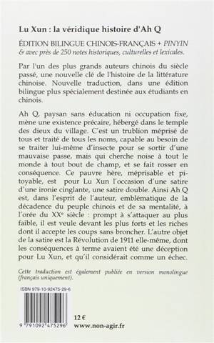 Ah Q est un journalier illettré, fanfaron et mégalomane, qui n'aime rien tant que boire, chercher querelle à ses semblables et inventer avec succès des moyens de se persuader qu'être battu comme plâtre - ce qui lui arrive souvent - est un signe infaillible de supériorité. Bête et plutôt méchant, sa naïveté et la nullité de son pouvoir de nuisance le rendent presque attendrissant. Plongé sans défense dans l'univers médiocre d'une petite ville où les préjugés, la xénophobie, la veulerie à l'égard des riches et des puissants règnent en maître, il sera broyé par sa propre bêtise tout autant que par celle des autres.