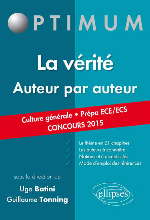 Destiné aux élèves de classes préparatoires économiques et commerciales, cet ouvrage a pour vocation de devenir le compagnon du cours de culture générale tout au long de l’année. Regroupant des auteurs clefs sur le thème du programme, la vérité, ainsi que des exemples précis tirés aussi bien de la littérature que du septième art, il cherche à mettre en valeur les éléments essentiels des différentes doctrines tout en facilitant leur utilisation au sein d’une dissertation. Dans cette perspective, chaque article est encadré par d’utiles suppléments qui visent à faciliter son appropriation mais aussi son utilisation :