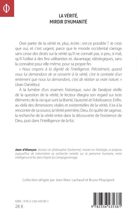 Oser parler de la vérité et, plus, écrire est-ce possible ? Je crois que oui, et c'est urgent, parce que le monde occidental s'arroge sans cesse des droits sur la vérité qu'il ne connaît pas, si peu, si mal, qu'il l'utilise à des fins utilitaristes et, davantage, idéologiques, sans la connaître pour elle-même, pour sa propre fin. À la lumière d'un examen historique, suivi de l'analyse réelle de la question de la vérité, le lecteur élargira son regard sur trois éléments de la vie que sont la liberté, l'autorité et l'obéissance. Enfin, au-delà des dimensions vitales et existentielles de la vérité, il ira à la rencontre de sa source, la Vérité première, Dieu. En quête de sagesse, la recherche de la vérité entre dans la découverte de l'existence de Dieu, puis dans l'intelligence de la foi.