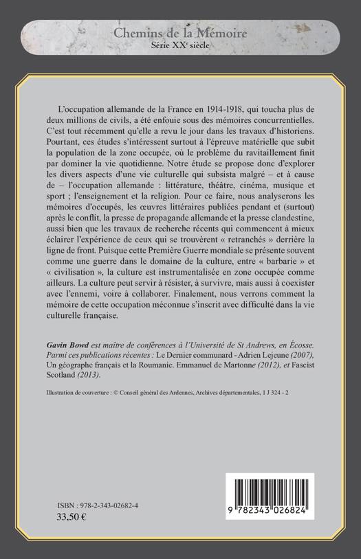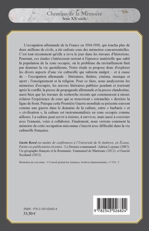L'occupation allemande de la France en 1914-1918 a revu le jour tout récemment dans les travaux d'historiens. Ce livre explore les divers aspects d'une vie culturelle qui subsista malgré et à cause de l'occupation allemande : littérature, théâtre, cinéma, musique, sport, enseignement, et religion. Pour ce faire, il analyse des mémoires d'occupés, les oeuvres littéraires publiées pendant et après le conflit, la presse de propagande allemande et la presse clandestine, ainsi que les travaux de recherche récents.
