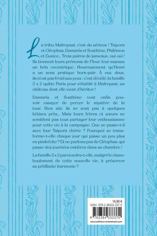 "Il règne dans la famille 3x2 une pétillante folie douce. Les parents, Henri et Fleur, veillent au grain du mieux qu’ils peuvent : dans une fratrie constituée de trois paires de jumeaux (d’où le « 3x2 »…), prendre sa place est un défi ! Quand Henri et Fleur apprennent aux enfants qu’ils vont quitter Paris pour emménager dans le château familial à rénover, c’est le festival des émotions ! L’une est dévastée, l’autre préfère ne rien dire, le suivant en rêvait, et la petite dernière se demande comment elle va expliquer tout ça à ses cochons d’Inde… La famille se met en route, sans se douter que l’arrivée leur réserve une surprise : le compte bancaire soigneusement rempli par l’ancienne propriétaire en vue des travaux a été vidé… C’est la catastrophe ! Une seule solution : se mettre à la recherche du mythique trésor du château…