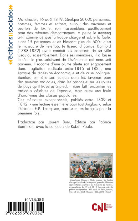 Manchester, 16 août 1819. Quelque 60 000 personnes, hommes, femmes et enfants, surtout des ouvrières et ouvriers du textile, sont rassemblées pacifiquement pour des réformes démocratiques. À peine le meeting a-t-il commencé que la troupe charge et sabre la foule, tuant 15 personnes et en blessant plus de 600 : c'est le massacre de Peterloo. Le tisserand Samuel Bamford (1788-1872) avait conduit les habitants de sa ville jusqu'au rassemblement. Dans ses mémoires, il a laissé le récit le plus saisissant de l'événement qui nous soit parvenu. Il raconte d'une plume alerte son engagement dans l'agitation radicale entre 1816 et 1821, une époque de récession économique et de crise politique. Bamford emmène ses lecteurs dans les tavernes pour des réunions radicales, dans les prisons et sur les routes du pays qu'il traverse à pied. Il nous fait rencontrer les radicaux célèbres de l'époque, mais aussi une foule d'anonymes des classes populaires.