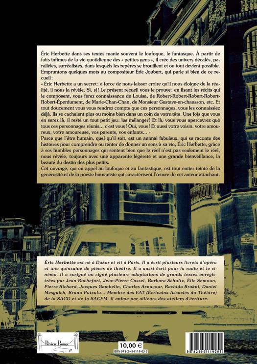 Quand la littérature se fait légère, comique et poétique. Parce que l’être humain quel qu’il soit est un animal fabuleux qui se raconte des histoires pour comprendre ou tenter de donner un sens à sa vie, Éric Herbette, grâce à ses humbles personnages, semblant tout droit sortis d'un film de Tati et, qui sentent bien que le réel n’est pas seulement le réel, nous révèle la beauté du destin des plus petits. Il faut, pour bien s’en rendre compte, suivre le céphalophore Robert-Robert-Robert-Robert Éperdument, Louisa cinq centimètres au-dessus du sol qui se retrouve, tel un ballon d’hélium, coincée dans l’angle du plafond du salon, Félicien passant son existence sur le strapontin d’un théâtre et tant d’autres encore qui peuplent ce beau recueil de nouvelles…