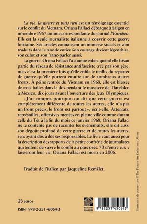 La vie, la guerre et puis rien est un temoignage essentiel sur le conflit du Vietnam. Oriana Fallaci debarque a Saigon en novembre 1967 comme correspondante du journal l'Europeo. Elle est la seule journaliste italienne a couvrir cette guerre lointaine. Ses articles connaissent un immense succes et sont traduits dans le monde entier. Son courage devient legendaire, son culot et son franc-parler aussi. La guerre, Oriana Fallaci l'a connue enfant quand elle faisait partie du reseau de resistance antifasciste cree par son pere, mais c'est la premiere fois qu'elle enfile le treillis du reporter de guerre qu'elle portera ensuite sur de nombreux autres fronts. A peine rentree du Vietnam en 1968, elle est blessee de trois balles dans le dos pendant le massacre de Tlatelolco a Mexico, dix jours avant l'ouverture des Jeux Olympiques. J'ai compris pourquoi on dit que cette guerre est completement differente de toutes les autres, elle n'a pas un front precis, le front est partout , ecrit-elle. Attentats, represailles, offensives menees en pleine ville comme durant celle du Tet a la fin du mois de janvier 1968, Oriana Fallaci ne se contente pas de raconter les evenements, elle dit aussi son degout profond de cette guerre et de toutes les autres, renvoyant dos a dos ses responsables. Le livre vaut aussi pour la description des rapports de la petite confrerie de journalistes qui tentent de suivre le conflit au plus pres. 70 d'entre eux y laisseront leur vie. Oriana Fallaci est morte en 2006.