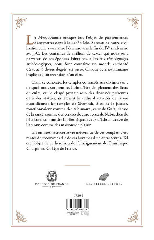 La Mesopotamie antique fait l'objet de passionnantes decouvertes depuis le XIXe siecle. Berceau de notre civilisation, elle a vu naitre l'ecriture vers la fin du IVe millenaire av. J.-C. Les centaines de milliers de textes qui nous sont parvenus de ces epoques lointaines, allies aux temoignages archeologiques, nous font connaitre un monde enchante ou tout, a divers degres, est sacre. Chaque activite humaine implique l'intervention d'un dieu. Dans ce contexte, les temples consacres aux divinites ont de quoi nous surprendre. Loin d'etre simplement des lieux de culte, ou le clerge prenait soin des divinites presentes dans des statues, ils etaient le cadre d'activites de la vie quotidienne: les temples de Shamash, dieu de la justice, fonctionnaient comme des tribunaux; ceux de Gula, deesse de la sante, comme des centres de cure; ceux de Nabu, dieu de l'ecriture, comme des bibliotheques; ceux d'Ishtar, deesse de l'amour, comme des maisons de plaisir. En un mot, retracer la vie meconnue de ces temples, c'est tenter de recouvrer celle de ces hommes d'un autre temps. Tel est l'objet de ce livre issu de l'enseignement de Dominique Charpin au College de France.