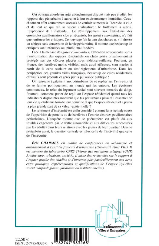 Cet ouvrage aborde un sujet abondamment discuté mais peu étudié : les rapports des périurbains à autrui et à leur environnement immédiat. Ceux-ci sont en effet couramment accusés de vouloir se mettre à l'écart de la ville et de tout ce qui fait sa valeur civilisatrice. Le développement, aux Etats-Unis, des ensembles pavillonnaires clos et sécurisés, les gated communities, n'a fait que renforcer les critiques. Cet ouvrage fait la part des choses et, s'il dresse un tableau sans concession de la vie périurbaine, il montre que beaucoup de critiques sont infondées ou, plutôt, mal fondées.