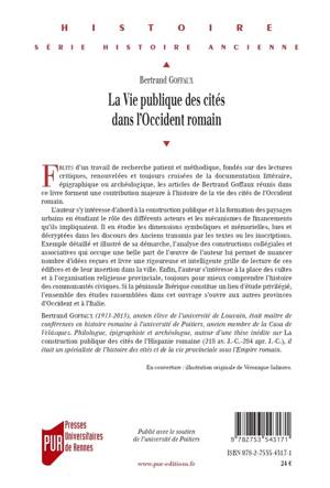 L’auteur s’y intéresse d’abord à la construction publique et à la formation des paysages urbains en étudiant le rôle des différents acteurs et les mécanismes de financements qu’ils impliquaient. Il en étudie les dimensions symboliques et mémorielles, lues et décryptées dans les discours des Anciens transmis par les textes ou les inscriptions. Exemple détaillé et illustré de sa démarche, l’analyse des constructions collégiales et associatives qui occupe une belle part de l’oeuvre de l’auteur lui permet de nuancer nombre d’idées reçues et livre une rigoureuse et intelligente grille de lecture de ces édifices et de leur insertion dans la ville. Enfin, l’auteur s’intéresse à la place des cultes et à l’organisation religieuse provinciale, toujours pour mieux comprendre l’histoire des communautés civiques. Si la péninsule Ibérique constitue un lieu d’étude privilégié, l’ensemble des études rassemblées dans cet ouvrage s’ouvre aux autres provinces d’Occident et à l’Italie.