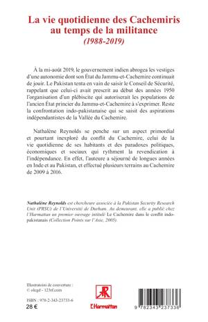 À la mi-août 2019, le gouvernement indien abrogea les vestiges d’une autonomie dont son État du Jammu-et-Cachemire continuait de jouir. Le Pakistan tenta en vain de saisir le Conseil de Sécurité, rappelant que celui-ci avait prescrit au début des années 1950 l’organisation d’un plébiscite qui autoriserait les populations de l’ancien État princier du Jammu-et-Cachemire à s’exprimer. Reste la confrontation indo-pakistanaise qui se saisit des aspirations indépendantistes de la Vallée du Cachemire. Nathalène Reynolds a séjourné de longues années en Inde et au Pakistan ; elle se penche sur un aspect primordial et pourtant inexploré du conflit du Cachemire, celui de la vie quotidienne de ses habitants et des paradoxes politiques, économiques et sociaux qui rythment la revendication à l’indépendance.