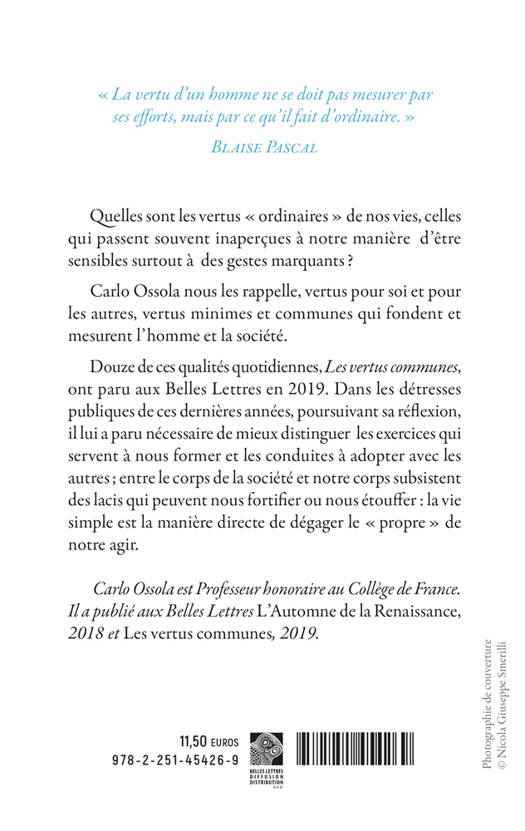 Quelles sont les vertus ordinaires de nos vies, celles qui passent souvent inapercues a notre maniere d'etre sensibles surtout a des gestes marquants ? Carlo Ossola nous les rappelle, vertus pour soi et pour les autres, vertus minimes et communes qui fondent et mesurent l'homme et la societe. Douze de ces qualites quotidiennes, Les vertus communes, ont paru aux Belles Lettres en 2019. Dans les detresses publiques de ces dernieres annees, poursuivant sa reflexion, il lui a paru necessaire de mieux distinguer les exercices qui servent a nous former et les conduites a adopter avec les autres; entre le corps de la societe et notre corps subsistent des lacis qui peuvent nous fortifier ou nous etouffer: la vie simple est la maniere directe de degager le propre de notre agir.
