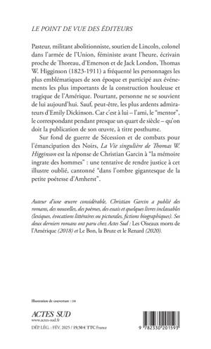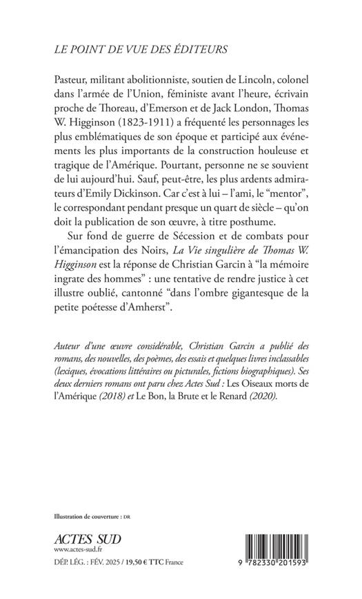 Pasteur, militant abolitionniste, soutien de Lincoln, colonel dans l'armée de l'Union, féministe avant l'heure, écrivain proche de Thoreau, d'Emerson et de Jack London, Thomas W. Higginson (1823-1911) a fréquenté les personnages les plus emblématiques de son époque et participé aux événements les plus importants de la construction houleuse et tragique de l'Amérique. Pourtant, personne ne se souvient de lui aujourd'hui. Sauf, peut-être, les plus ardents admirateurs d'Emily Dickinson. Car c'est à lui - l'ami, le "mentor", le correspondant pendant presque un quart de siècle - qu'on doit la publication de son oeuvre, à titre posthume. Sur fond de guerre de Sécession et de combats pour l'émancipation des Noirs, "La Vie singulière de Thomas W. Higginson" est la réponse de Christian Garcin à "la mémoire ingrate des hommes" : une tentative de rendre justice à cet illustre oublié, cantonné "dans l'ombre gigantesque de la petite poétesse d'Amherst"