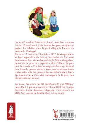 Jacinta (7 ans) et Francisco (9 ans), avec leur cousine Lucia (10 ans), sont trois jeunes bergers, simples et joyeux. Ils habitent dans le petit village de Fatima, au centre du Portugal. Entre le 13 mai et le 13 octobre 1917, la Vierge Marie va leur apparaître six fois et ces visites du Ciel vont bouleverser leur vie. À chaque fois, la Sainte Vierge leur demande de prier le chapelet « afin d'obtenir la paix pour le monde ». Elle leur enseigne de belles prières et leur livre de graves secrets. Avec une tendresse toute maternelle, elle les guide et les réconforte dans leurs épreuves et fera d'eux des messagers de la paix, des témoins de son amour. Jacinta et Francisco ont été béatifiés le 13 mai 2000 par Jean-Paul II. Lucia, devenue religieuse, s'est éteinte en 2005. Son procès de béatification est en cours. A propos de Francine Bay : Mère de famille nombreuse, catéchiste, elle est l'auteur de 25 livres, récits d'apparitions et vies de saints, histoire de l'Eglise, dont le succès ne se dément pas.