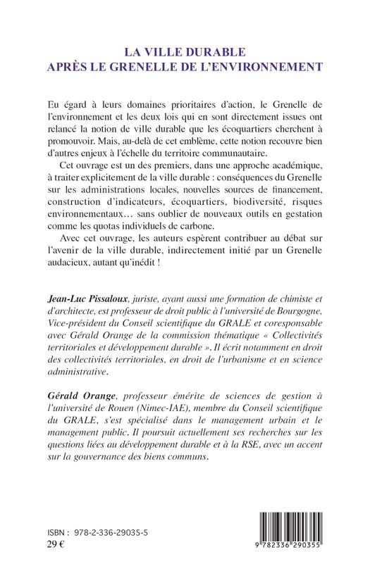 Cet ouvrage traite explicitement de la ville durable : conséquences du Grenelle de l'environnement sur les administrations locales, nouvelles sources de financement, construction d'indicateurs, écoquartiers, biodiversité, risques environnementaux... sans oublier de nouveaux outils en gestation comme les quotas indivuduels de carbone.