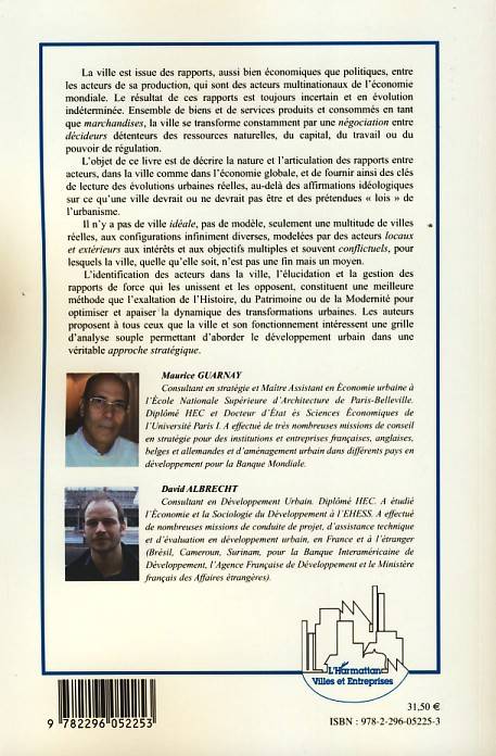 Ce livre décrit la nature et l'articulation des rapports entre acteurs, dans la ville comme dans l'économie globale, et fournit ainsi des clés de lecture des évolutions urbaines réelles, au-delà des affirmations idéologiques sur ce qu'une ville devrait ou ne devrait pas être et des prétendues "lois" de l'urbanisme. Les auteurs nous proposent une grille d'analyse souple permettant d'aborder le développement urbain dans une véritable approche stratégique.