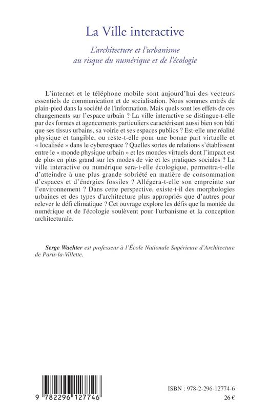 L'internet et le téléphone mobile sont aujourd'hui des vecteurs essentiels de communication et de socialisation. Nous sommes entrés de plain-pied dans la société de l'information. Mais quels sont les effets de ces changements sur l'espace urbain ? La ville interactive se distingue-t-elle par des formes et agencements particuliers caractérisant aussi bien son bâti que ses tissus urbains, sa voirie et ses espaces publics ? Cet ouvrage explore les défis que la montée du numérique et de l'écologie soulèvent pour l'urbanisme et la conception architecturale.