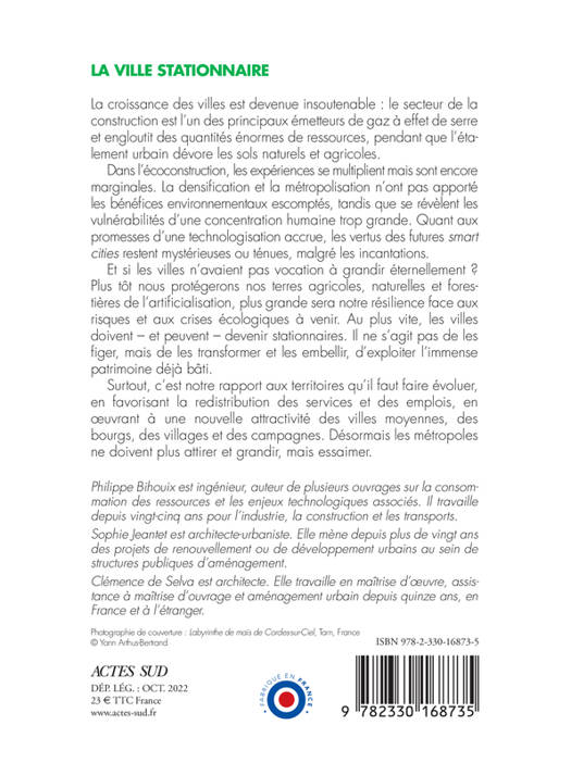 La croissance des villes est devenue insoutenable : le secteur de la construction est l'un des principaux émetteurs de gaz à effet de serre et engloutit des quantités énormes de ressources, pendant que l'étalement urbain dévore les sols naturels et agricoles. Dans l'écoconstruction, les expériences se multiplient mais sont encore marginales. La densification et la métropolisation n'ont pas apporté les bénéfices environnementaux escomptés, tandis que se révèlent les vulnérabilités d'une concentration humaine trop grande. Quant aux promesses d'une technologisation accrue, les vertus des futures smart cities restent mystérieuses ou ténues, malgré les incantations. Et si les villes n'avaient pas vocation à grandir éternellement ? Plus tôt nous protégerons nos terres agricoles, naturelles et forestières de l'artificialisation, plus grande sera notre résilience face aux risques et aux crises écologiques à venir. Au plus vite, les villes doivent - et peuvent - devenir stationnaires. Il ne s'agit pas de les figer, mais de les transformer et les embellir, d'exploiter l'immense patrimoine déjà bâti. Surtout, c'est notre rapport aux territoires qu'il faut faire évoluer, en favorisant la redistribution des services et des emplois, en oeuvrant à une nouvelle attractivité des villes moyennes, des bourgs, des villages et des campagnes. Désormais les métropoles ne doivent plus attirer et grandir, mais essaimer.