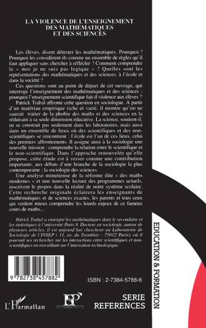 Les élèves disent détester les mathématiques. Pourquoi les considèrent-ils comme un ensemble de règles qu'il faut appliquer sans chercher à réfléchir ? Quelles sont les représentations des mathématiques et des sciences, à l'école et dans la société ? Ces questions sont au point de départ de cet ouvrage, pourquoi l'enseignement scientifique fait-il violence aux élèves ? Une analyse minutieuse de la réforme dite " des maths modernes " et une nouvelle lecture des programmes actuels, inscrivent le propos dans la réalité de notre système scolaire.