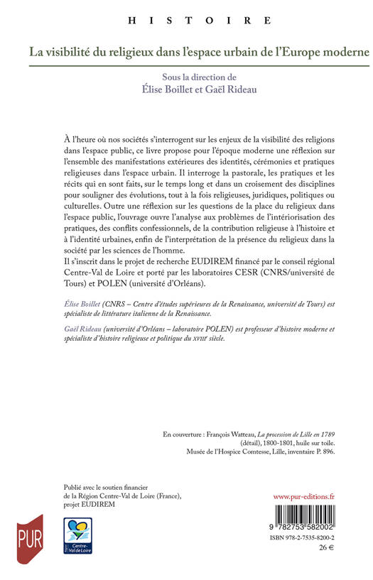 À l'heure où nos sociétés s'interrogent sur les enjeux de la visibilité des religions dans l'espace public, ce livre propose pour l'époque moderne une réflexion sur l'ensemble des manifestations extérieures des identités, cérémonies et pratiques religieuses dans l'espace urbain. Il interroge la pastorale, les pratiques et les récits qui en sont faits, sur le temps long et dans un croisement des disciplines pour souligner des évolutions, tout à la fois religieuses, juridiques, politiques ou culturelles. Outre une réflexion sur les questions de la place du religieux dans l'espace public, l'ouvrage ouvre l'analyse aux problèmes de l'intériorisation des pratiques, des conflits confessionnels, de la contribution religieuse à l'histoire et à l'identité urbaines, enfin de l'interprétation de la présence du religieux dans la société par les sciences de l'homme.