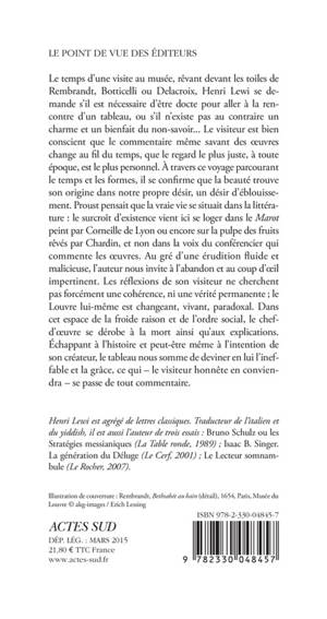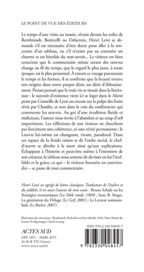 Le temps d'une visite au musée, rêvant devant les toiles de Rembrandt, Botticelli ou Delacroix, Henri Lewi se demande s'il est nécessaire d'être docte pour aller à la rencontre d'un tableau, ou s'il n'existe pas au contraire un charme et un bienfait du non-savoir... Le visiteur est bien conscient que le commentaire même savant des oeuvres change au fil du temps, que le regard le plus juste, à toute époque, est le plus personnel. À travers ce voyage parcourant le temps et les formes, il se confirme que la beauté trouve son origine dans notre propre désir, un désir d'éblouissement. Proust pensait que la vraie vie se situait dans la littérature : le surcroît d'existence vient ici se loger dans le «Marot» peint par Corneille de Lyon ou encore sur la pulpe des fruits rêvés par Chardin, et non dans la voix du conférencier qui commente les oeuvres. Au gré d'une érudition fluide et malicieuse, l'auteur nous invite à l'abandon et au coup d'oeil impertinent. Les réflexions de son visiteur ne cherchent pas forcément une cohérence, ni une vérité permanente ; le Louvre lui-même est changeant, vivant, paradoxal. Dans cet espace de la froide raison et de l'ordre social, le chefd'oeuvre se dérobe à la mort ainsi qu'aux explications. Échappant à l'histoire et peut-être même à l'intention de son créateur, le tableau nous somme de deviner en lui l'ineffable et la grâce, ce qui - le visiteur honnête en conviendra - se passe de tout commentaire.