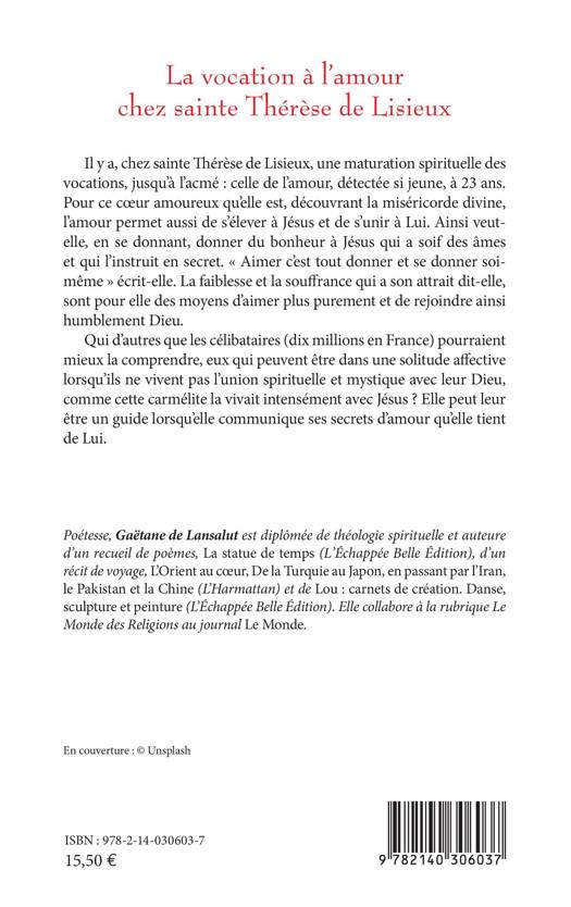 Il y a, chez sainte Thérèse de Lisieux, une maturation spirituelle des vocations, jusqu'à l'acmé celle de l'amour, détectée si jeune, à 23 ans. Pour ce coeur amoureux qu'elle est, découvrant la miséricorde divine, l'amour permet aussi de s'élever à Jésus et de s'unir à Lui. Ainsi veut-elle, en se donnant, donner du bonheur à Jésus qui a soif des âmes et qui l'instruit en secret. Aimer c'est tout donner et se donner soi-même, écrit-elle. La faiblesse et la souffrance qui a son attrait dit-elle, sont pour elle des moyens d'aimer plus purement et de rejoindre ainsi humblement Dieu. Qui d'autres que les célibataires (dix millions en France) pourraient mieux la comprendre, eux qui peuvent être dans une solitude affective lorsqu'ils ne vivent pas l'union spirituelle et mystique avec leur Dieu, comme cette carmélite la vivait intensément avec Jésus ? Elle peut leur être un guide lorsqu'elle communique ses secrets d'amour qu'elle tient de Lui.