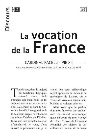 « Discours » est la nouvelle collection de Pierre Téqui éditeur. Cette collection comprend des textes courts et percutants pour aller directement à l'essentiel des enjeux de notre époque. Des textes d'opinion, d'histoire, de doctrine, de philosophie, de vie.. Ce numéro 2 est le formidable discours prononcé à Paris par le futur Pie XII sur la vocation de la France, retrouvé dans les greniers de la maison. Un discours qui nous aide à comprendre ce qu'est la France, non seulement une histoire, un passé, des racines, mais aussi une vocation particulière dans le concert des nations, un appel de Dieu, une aspiration vers l'avenir.