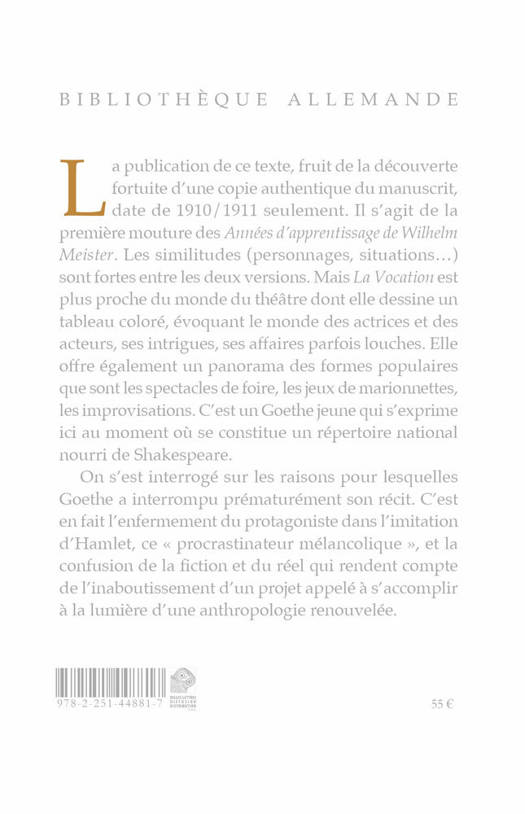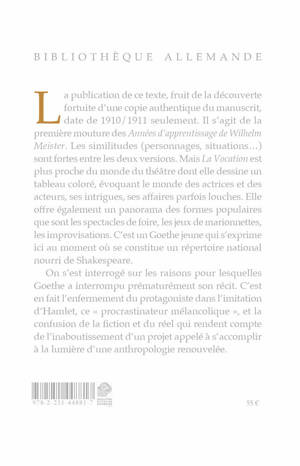 La publication de ce texte, fruit de la decouverte fortuite d'une copie authentique du manuscrit, date de 1910/1911 seulement. Il s'agit de la premiere mouture des Annees d'apprentissage de Wilhelm Meister. Les similitudes (personnages, situations...) sont fortes entre les deux versions. Mais La Vocation est plus proche du monde du theatre dont elle dessine un tableau colore, evoquant le monde des actrices et des acteurs, ses intrigues, ses affaires parfois louches. Elle offre egalement un panorama des formes populaires que sont les spectacles de foire, les jeux de marionnettes, les improvisations. C'est un Goethe jeune qui s'exprime ici au moment ou se constitue un repertoire national nourri de Shakespeare. On s'est interroge sur les raisons pour lesquelles Goethe a interrompu prematurement son recit. C'est en fait l'enfermement du protagoniste dans l'imitation d'Hamlet, ce procrastinateur melancolique , et la confusion de la fiction et du reel qui rendent compte de l'inaboutissement d'un projet appele a s'accomplir a la lumiere d'une anthropologie renouvelee.