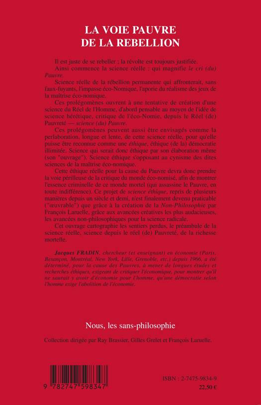 Il est juste de se rebeller ; la révolte est toujours justifiée. Ainsi commence la science réelle: qui magnifie le cri (du) Pauvre. Science réelle de la rébellion permanente qui affronterait, sans faux-fuyants, l'impasse éco-Nomique, l'aporie du réalisme des jeux de la maîtrise éco-nomique. Cette éthique réelle pour la cause du Pauvre devra donc prendre la voie périlleuse de la critique du monde éco-nomisé, afin de montrer l'essence criminelle de ce monde mortel (qui assassine le pauvre en toute indifférence).