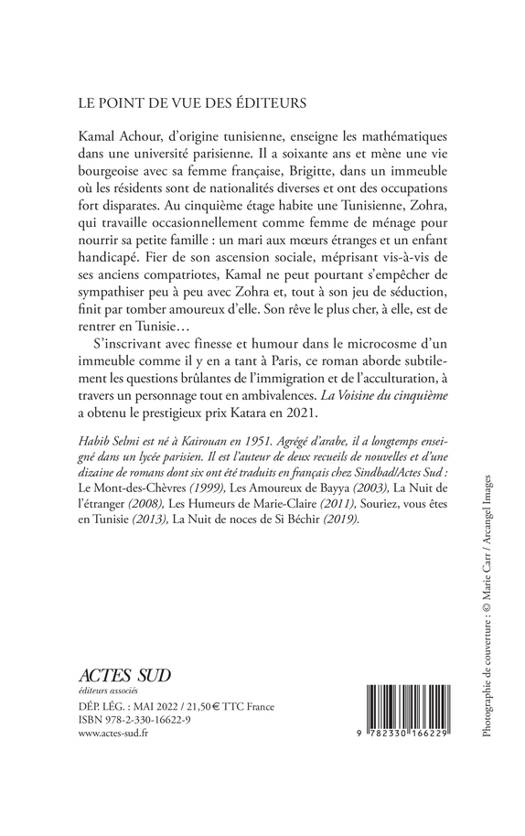 Kamal Achour, d'origine tunisienne, enseigne les mathématiques dans une université parisienne. Il a soixante ans et mène une vie bourgeoise avec sa femme française, Brigitte, dans un immeuble où les résidents sont de nationalités diverses et ont des occupations fort disparates. Au cinquième étage habite une Tunisienne, Zohra, qui travaille occasionnellement comme femme de ménage pour nourrir sa petite famille : un mari aux moeurs étranges et un enfant handicapé. Fier de son ascension sociale, méprisant vis-à- vis de ses anciens compatriotes, Kamal ne peut pourtant s'empêcher de sympathiser peu à peu avec Zohra et, tout à son jeu de séduction, finit par tomber amoureux d'elle. Son rêve le plus cher, à elle, est de rentrer en Tunisie... S'inscrivant avec finesse et humour dans le microcosme d'un immeuble comme il y en a tant à Paris, ce roman aborde subtilement les questions brûlantes de l'immigration et de l'acculturation, à travers un personnage tout en ambivalences. La Voisine du cinquième a obtenu le prestigieux prix Katara en 2021.