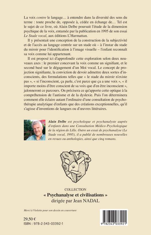 Alain Delbe poursuit l’étude de la dimension psychique de la voix, entamée par la publication en 1995 de son essai Le Stade vocal, aux éditions L’Harmattan. Il y présentait une conception de la construction de la subjectivité et de l’accès au langage centrée sur un stade où l’enfant reconnaît sa voix comme lui appartenant. Il s'est proposé ici d’approfondir cette exploration selon deux nouveaux axes : le premier concevant la voix comme un signifiant, et le second basé sur le dégagement d’un Moi vocal.