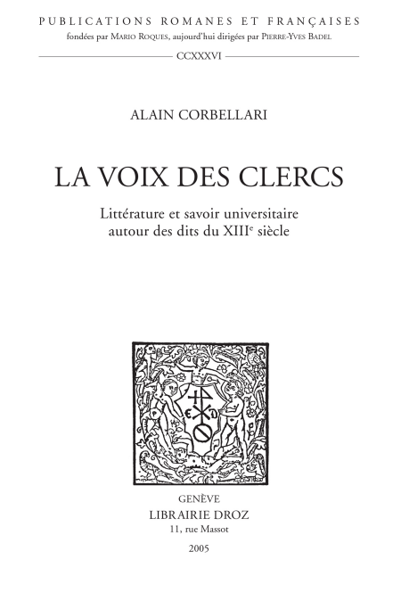 La Voix des clercs apprécie, dans la littérature française des XIIe et surtout XIIIe siècles, l’émergence d’une parole qui n’est ni celle des jongleurs, ni celle des prêtres, ni celle des romanciers, bien qu’elle entretienne d’évidents rapports avec chacune d’entre elles, mais qui émane de celui qui, au Moyen Age, est par excellence le détenteur du savoir et de l’écriture: le clerc. Alain Corbellari étudie la figure du clerc non pas tant pour son inscription dans une société dont il est l’un des rouages nécessaires qu’en raison de l’ambiguïté de son statut – à la frontière du monde laïc et de la vie religieuse –, l’entraînant à se désolidariser de ses commanditaires et à revendiquer pour son travail un espace nouveau destiné à devenir celui, proprement, de la littérature. En considérant les thèmes propices à l’expression d’une poétique de la rupture et en suivant trois acteurs déterminants de ce mouvement, Henri de Valenciennes (auteur probable du Lai d’Aristote), Henri d’Andeli et Rutebeuf, qui sont aussi les champions du dit, cette poésie récitée, se prêtant à toutes les formes du discours personnel et exaltant le je d’un clerc-écrivain, La Voix des clercs fait la chronique d’une mutation majeure de la société et dégage les enjeux que recèlent les codes littéraires d’une nouvelle parole poétique.