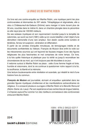 Ce livre est un contre-enquête sur le destin prodigieux (1902-1981) et tragique (1981-2024) de la mystique la plus controversée du XXe siècle. Tétraplégique, elle vécut durant plus de 50 ans, sans manger ni boire, couchée dans le même lit, dans un chambre plongée dans le noir où elle reçut plus de 100.000 visiteurs. Après sa mort, celle qu’on voulut béatifier, a fait l‘objet d’un massacre mémoriel d’une rare ampleur. Elle fut présentée comme une hystérique, une manipulatrice, une falsificatrice. Il ne resta de cette paysanne de la Drôme qu’un pantin obscur et fantomatique. L'auteur, au terme d’une enquête qui aura duré plus de dix ans et grâce à des documents inédits couverts par le secret du Vatican met à jour les mécanismes de cette démolition. Pourquoi a-t-on cherché non seulement à dissimuler mais à dénaturer un destin aussi remarquable ? Comment la légende et le mépris ont-ils triomphé d’une vie si extraordinaire qu’elle ne pouvait pas paraître vraie ?