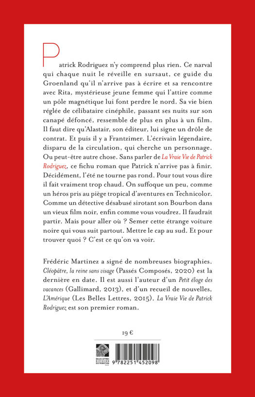 Patrick Rodriguez n'y comprend plus rien. Ce narval qui chaque nuit le reveille en sursaut, ce guide du Groenland qu'il n'arrive pas a ecrire et sa rencontre avec Rita, mysterieuse jeune femme qui l'attire comme un pole magnetique lui font perdre le nord. Sa vie bien reglee de celibataire cinephile, passant ses nuits sur son canape defonce, ressemble de plus en plus a un film. Il faut dire qu'Alastair, son editeur, lui signe un drole de contrat. Et puis il y a Frantzimer. L'ecrivain legendaire, disparu de la circulation, qui cherche un personnage. Ou peut-etre autre chose. Sans parler de La Vraie Vie de Patrick Rodriguez, ce fichu roman que Patrick n'arrive pas a finir. Decidement, l'ete ne tourne pas rond. Pour tout vous dire il fait vraiment trop chaud. On suffoque un peu, comme un heros pris au piege tropical d'aventures en Technicolor. Comme un detective desabuse sirotant son Bourbon dans un vieux film noir, enfin comme vous voudrez. Il faudrait partir. Mais pour aller ou ? Semer cette etrange voiture noire qui vous suit partout. Mettre le cap au sud. Et pour trouver quoi ? C'est ce qu'on va voir.