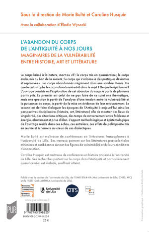 Le corps laissé à la nature, mort ou vif ; le corps mis en quarantaine ; le corps exclu, mis au ban de la société ; le corps qui s’adonne à des pratiques déviantes et réprouvées : les corps abandonnés s’égrènent dans une sombre litanie. De quelle catastrophe le corps abandonné est-il alors le sujet ? De quelle épiphanie ? L’ouvrage consiste en l’exploration de cet abandon du corps à partir de plusieurs partis pris. Le premier est celui de ne pas faire de ce sujet une thématique, mais une question à partir de l’analyse d’une tension entre la vulnérabilité et la puissance du corps, à partir de la mise en évidence de leur retournement. Le second est de faire dialoguer les époques de l’Antiquité à aujourd’hui ainsi les perspectives disciplinaires (histoire, art, littérature) afi n de montrer des lieux de singularité, des situations critiques, des temps de renversement entre faiblesse et énergie, abattement et prise d’élan. L’apport méthodologique et épistémologique de l’ouvrage réside dans ces échos, ces entrelacs, ces effets de palimpseste mis en oeuvre et à l’oeuvre au creux de ces dialectiques.