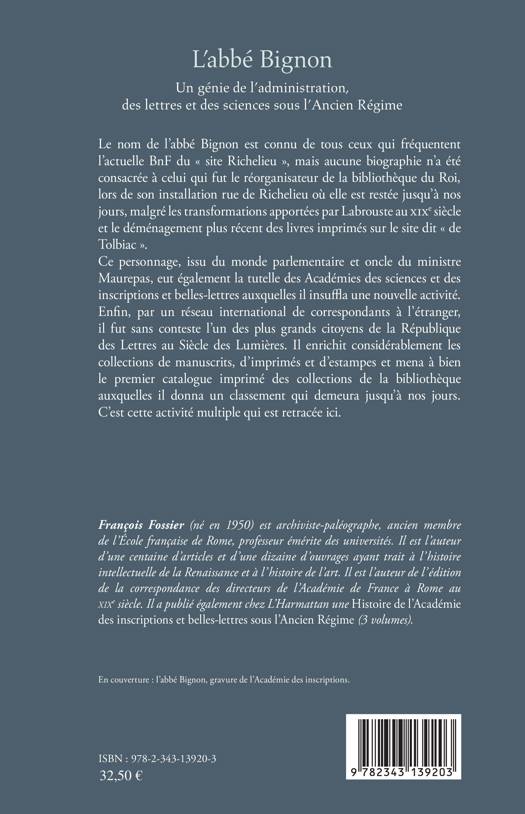 Le nom de l'abbé Bignon est connu de tous ceux qui fréquentent l'actuelle BnF du site « Richelieu », mais aucune biographie n'a été consacré à celui qui fut le réorganisateur de la bibliothèque du Roi. Ce personnage, issu du monde parlementaire et oncle du ministre Maurepas, eut également la tutelle des Académies des sciences et des inscriptions et belles-lettres auxquelles il insuffla une nouvelle activité. Il enrichit les collections de manuscrits, d'imprimés et d'estampes et mena à bien le premier catalogue imprimé des collections de la bibliothèque auxquelles il donna un classement qui demeura jusqu'à nos jours.
