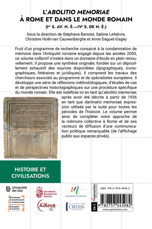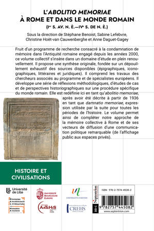 Fruit d’un programme de recherche consacré à la condamnation de mémoire dans l’Antiquité romaine, ce volume propose une synthèse originale, fondée sur un dépouillement exhaustif des sources disponibles (épigraphiques, iconographiques, littéraires et juridiques). Il développe une série de réflexions méthodologiques, d’études de cas et de perspectives historiographiques sur une procédure spécifique du monde romain, l’abolitio memoriae, et complète notre approche de la mémoire collective à Rome.
