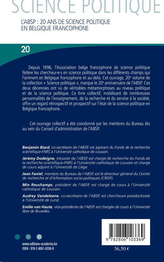 Depuis 1996, l'Association belge francophone de science politique fédère les chercheur·e·s en science politique dans les différents champs qui l'animent en Belgique francophone et au-delà. Cet ouvrage, 20e volume de la collection "Science politique", marque le 20e anniversaire de l'ABSP. Ces deux décennies ont vu de véritables métamorphoses au niveau politique et de la science politique. Ce livre collectif, mobilisant de nombreuses personnalités de l'enseignement, de la recherche et du service à la société, offre un regard rétrospectif et prospectif sur l'état de la science politique en Belgique francophone.