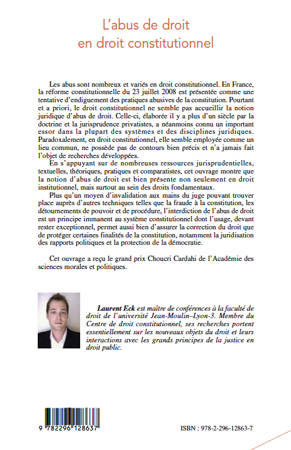 S'appuyant sur de nombreuses ressources, cet ouvrage montre la présence de la notion juridique d'abus de droit en droit institutionnel et au sein des droits fondamentaux. L'interdiction de l'abus de droit est un principe immanent au système constitutionnel dont l'usage, devant rester exceptionnel, permet aussi bien d'assurer la correction du droit que de protéger certaines finalités de la constitution, notamment la juridisation des rapports politiques et la protection de la démocratie.