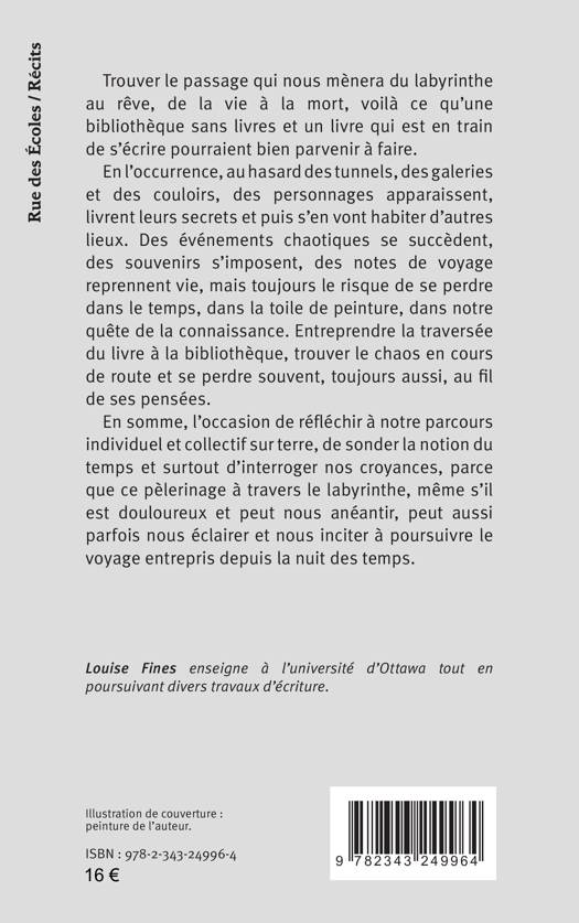 Trouver le passage qui nous mènera du labyrinthe au rêve, de la vie à la mort, voilà ce qu’une bibliothèque sans livres et un livre qui est en train de s’écrire pourraient bien parvenir à faire. En l’occurrence, au hasard des tunnels, des galeries et des couloirs, des personnages apparaissent, livrent leurs secrets et puis s’en vont habiter d’autres lieux. Des événements chaotiques se succèdent, des souvenirs s’imposent, des notes de voyage reprennent vie, mais toujours le risque de se perdre dans le temps, dans la toile de peinture, dans notre quête de la connaissance. Entreprendre la traversée du livre à la bibliothèque, trouver le chaos en cours de route et se perdre souvent, toujours aussi, au fil de ses pensées.
