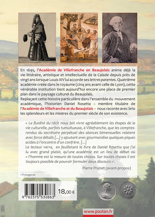 En 1695, l’Académie de Villefranche en Beaujolais anime déjà la vie littéraire, artistique et intellectuelle de la Calade depuis près de vingt ans lorsque Louis XIV lui accorde ses lettres patentes. Quatrième académie créée dans le royaume (cinq ans avant celle de Lyon), cette vénérable institution tient aujourd’hui encore une place de premier plan dans le paysage culturel du Beaujolais. Replaçant cette histoire particulière dans l’ensemble du mouvement académique, l’historien Daniel Rosetta – membre titulaire de l’Académie de Villefranche et du Beaujolais – nous raconte avec brio les splendeurs et les misères du premier siècle de son existence.