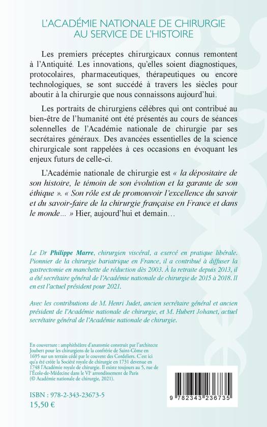 Les premiers préceptes chirurgicaux connus remontent à l'Antiquité. Les innovations se sont succédé à travers les siècles pour aboutir à la chirurgie que nous connaissons aujourd'hui. Les portraits de chirurgiens célèbres qui ont contribué au bien-être de l'humanité ont été présentés au cours de séances solennelles de l'Académie nationale de chirurgie par ses secrétaires généraux. Des avancées essentielles de la science chirurgicale sont rappelées à ces occasions en évoquant les enjeux futurs de celle-ci. L'Académie nationale de chirurgie est la dépositaire de son histoire, le témoin de son évolution et la garante de son éthique . Son rôle est de promouvoir l'excellence du savoir et du savoir-faire de la chirurgie française en France et dans le monde... Hier, aujourd'hui et demain...