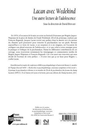 En 1974, à l'occasion de la mise en scène au festival d'Automne par Brigitte Jaques- Wajeman de la pièce de théâtre de Frank Wedekind, EÉveil du printemps, traduite par François Régnault, Jacques Lacan écrivit une préface dont la dansité est à la mesure du chantier qu'il poursuivit pour remettre la psychanalyse sur ses pieds. Revenir aujourd'hui à ce texte de Lacan, à ses surprises et à ses énigmes, est l'occasion de souligner son abord nouveau de l'adolescence, et ce que celui-ci nous enseigne pour la pratique et l'éthique de la psychanalyse. Parmi les différentes contributions de cet ouvrage, nous trouverons notamment les témoignages et commentaires inédits de Brigitte Jaques-Wajeman et François Régnault. Car c'est aussi une rencontre qui aura décidé de l'écriture de cette préface : "Il n'est rien que je ne fasse pour Brigitte", confia Lacan.