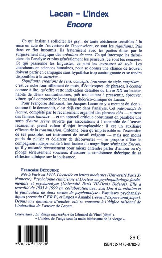 Signifiants, création de sens, concepts, tournures de style, surprises… C'est ce riche fourmillement de mots, d'équivoques, de phrases, à écouter comme à lire, qu'offre cette indexation détaillée du Livre XX au lecteur, habité de désirs contradictoires, prêt à pressentir, éprouver, vibrer et comprendre le message théorico-clinique de Lacan. Cet index-mode de lecture, complété par le recensement de phrases-clé -surtout des fameux bateaux- et un appareil critique constituant en parallèle une sorte d'autre scène ouverte par associations à l'ensemble de l'œuvre lacanienne, prend valeur d'objet irremplaçable : il est un auxiliaire efficace de la transmission.
